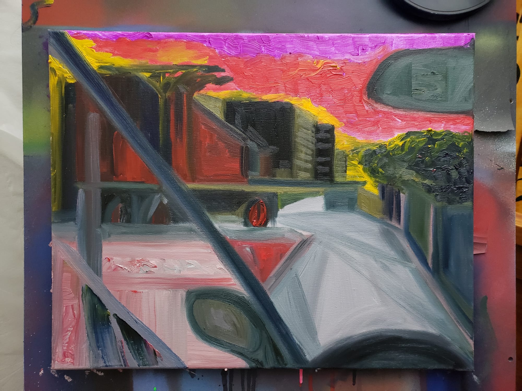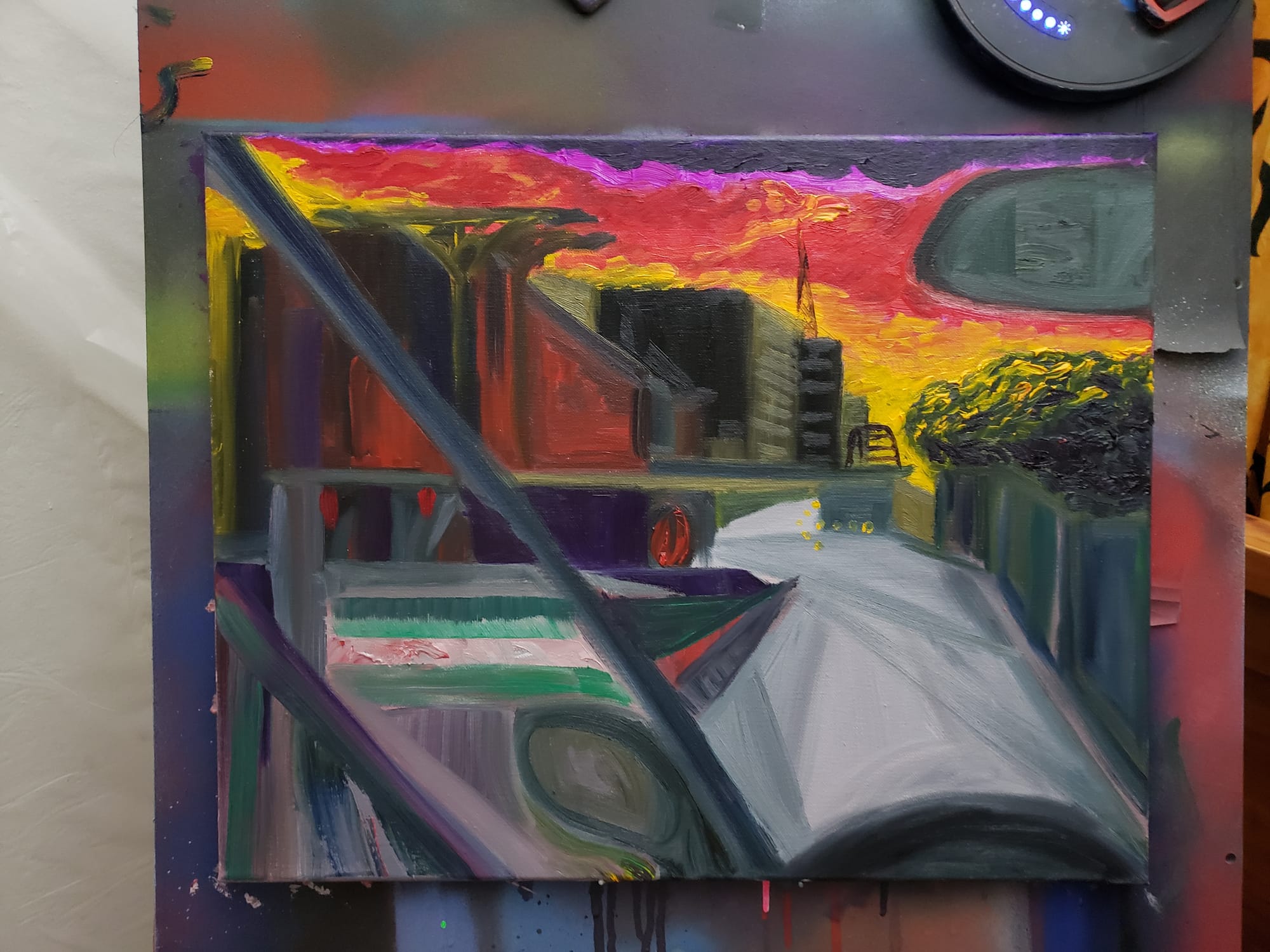A spiritual sequel to Highway Abstract I painted a couple years later. I used the "sport burst" mode to get roughly 2000 pictures going onto the highway from the Ford Street onramp (I wasn't the one driving; I am not that reckless) and synthesized them into this. If I were doing it again, I'd probably omit the arrow sign and spend longer on making the buildings weird.