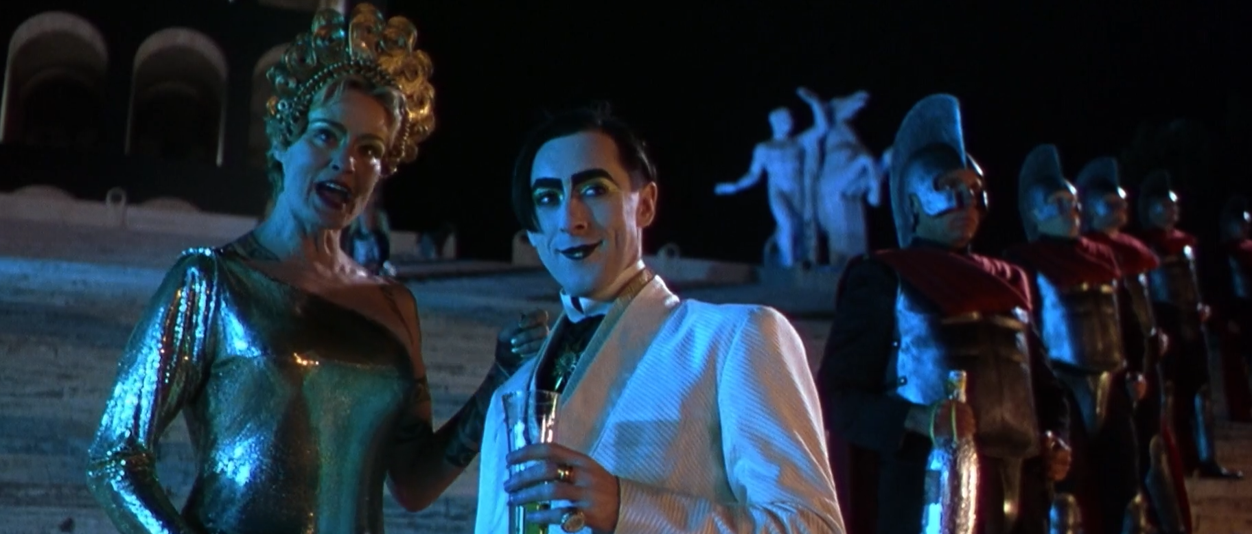 I feel like anything I write in synopsis is going to fail to describing the surreal approaches this film takes; like it's source material, it does not place itself in time — Shakespeare set Titus Andronicus in a sort of aggregated post-Octavian Rome — but it also incorporates modernities like wolf-headed motorcycles among the swords, sandals, breastplates and bathhouses.