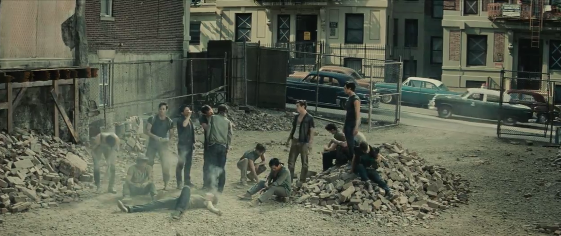 [1] "When you're a Jet, you're a Jet all the way,"; the Jets, a hooligan gang, control their eight or so blocks of the Upper West Side, and they have a long-simmering feud with the Sharks, a Puerto Rican gang that is de-escalated by various community members when it threatens to boil over into full-out violence. [2] At a social mixer both the Jets and Sharks attend, where Tony, a Jet who is lying low and trying not to be involved in Official Jet Business due to his youth being the only thing that got him out of a manslaughter charge, dances with Maria, and the two fall in love. [3] Riff, the leader of the Jets, wants to organize a rumble to have it out once and for all with the Sharks; they set terms and despite the best efforts of cooler heads and authorities, Riff ends up killed by Bernardo [the leader of the Sharks and older brother of Maria], and Tony in a fit of rage, kills Bernardo, then flees to the neutral ground of the basement of the soda fountain. [4] Anita, Bernardo's girlfriend, goes to warn Tony that Maria will be late, but menaced by the idle Jets, instead delivers the lie that Chino, Bernardo's best friend, killed Maria for dancing with Tony. [5] Tony, grief-stricken, goes out to find Chino so that he can be killed as well; just as he sees Maria, he is shot by Chino, and Maria's grief causes her to grab Chino's gun, pick it up and threaten both gangs; she drops it before she can fire on anyone, and both gangs pick up Tony's corpse, the feud mended.